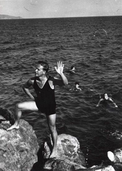 Fyra unga män iklädda baddräkter. Tre som badar och en står klipporna. Baddräkten exempel på äldre tiders baddräktsmode.