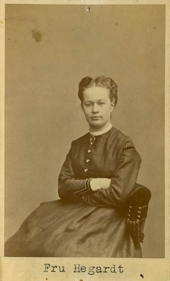 Porträttet föreställer Hilda Hegardt, född Carlström. Hon var gift med Gustaf Hegardt som också är avbildad här och som jag just identifierat. Hilda var född i Vassända-Naglum 1849 och dog (på besök i Karlstad) 1923