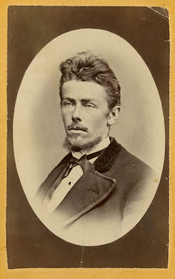 Text på kortets baksida: "Teodor Swahn. Löjtnant. Född 22/11 1855 å Skärbo, död 24/2 1915 i Stockholm. Dog ogift".