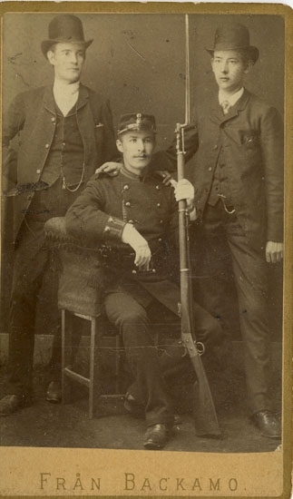 Text på kortets baksida: "Handelsbitr. C. Olsson. Kamrer Ad Lundgren. Stins F Th Persson 1891".