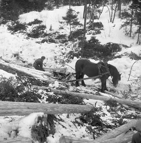 Skogshuggare och häst med timmerkärra