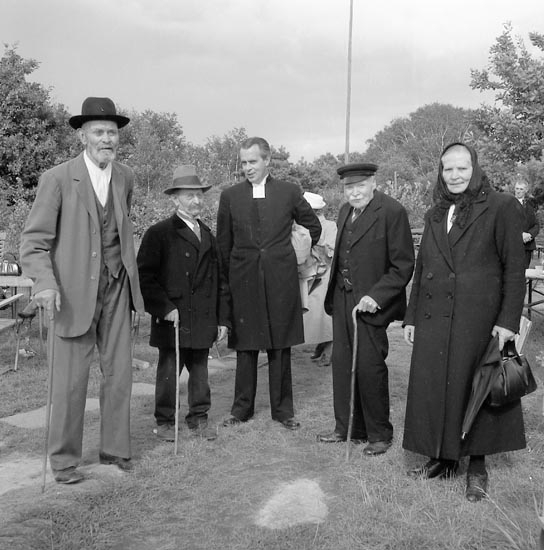Äldre sällskap med präst i mitten har ställt upp sig i augustisolen på Skansberget i Uddevalla