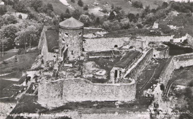 Tryckt text på kortet: "Flygfoto över Bohus Fästning, Kungälv".
