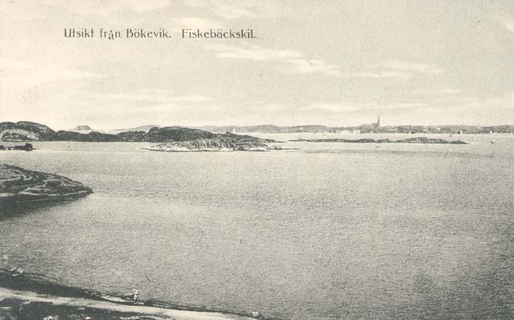 Tryckt text på kortet: "Utsikt från Bökevik, Fiskebäckskil."