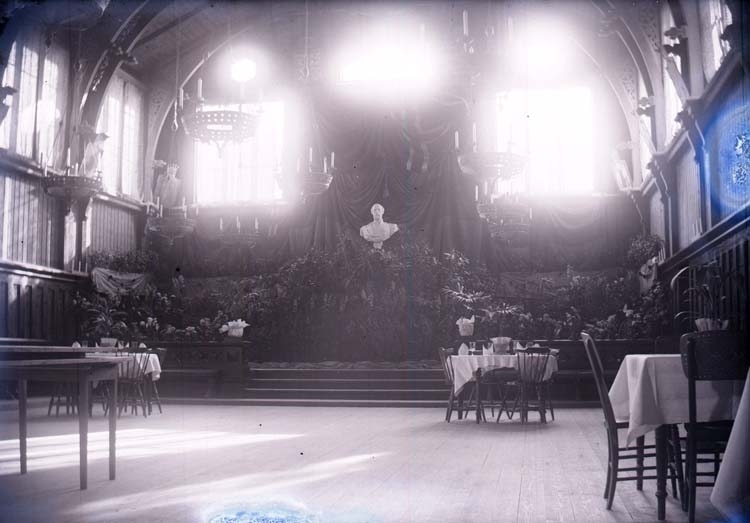 Enligt text som medföljde bilden: "Interiör af Societetshuset vid kungajubiléet 1897".