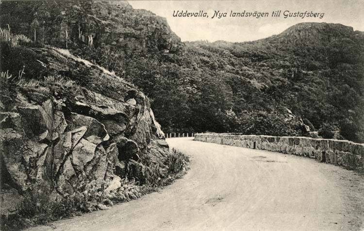 Tryckt text på vykortets framsida: "Uddevalla, Nya Landsvägen till Gustafsberg."