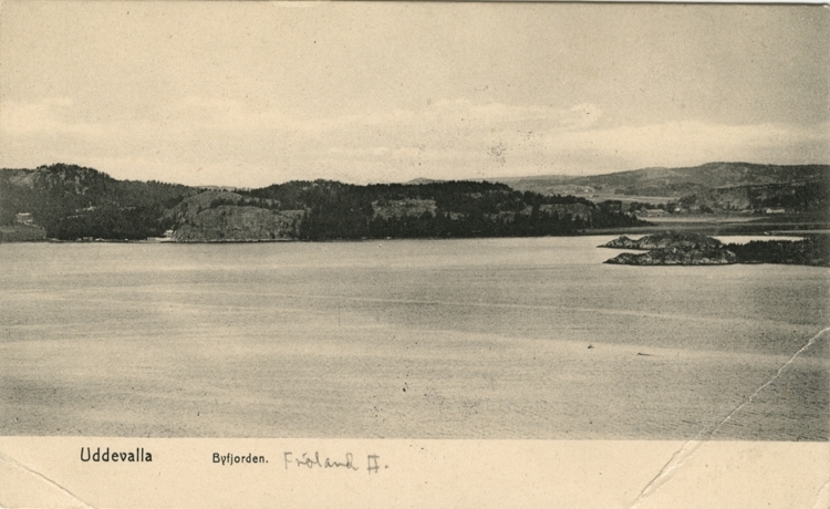 Tryckt text på vykortets framsida: "Uddevalla, Byfjorden."