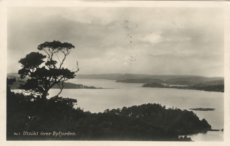 Tryckt text på vykortets framsida: "Utsikt över Byfjorden."