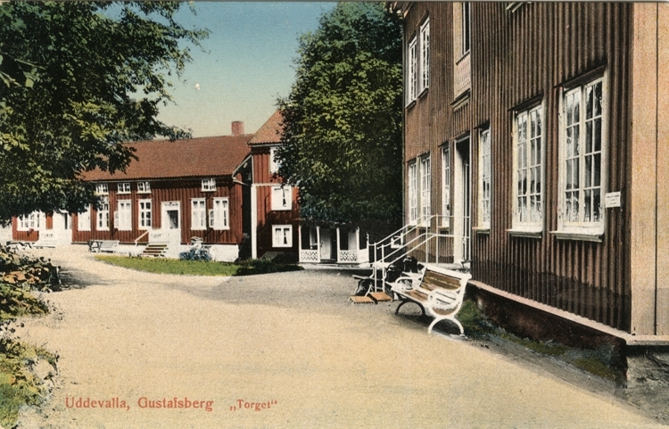 Tryckt text på vykortets framsida: "Uddevalla Gustafsberg Torget."