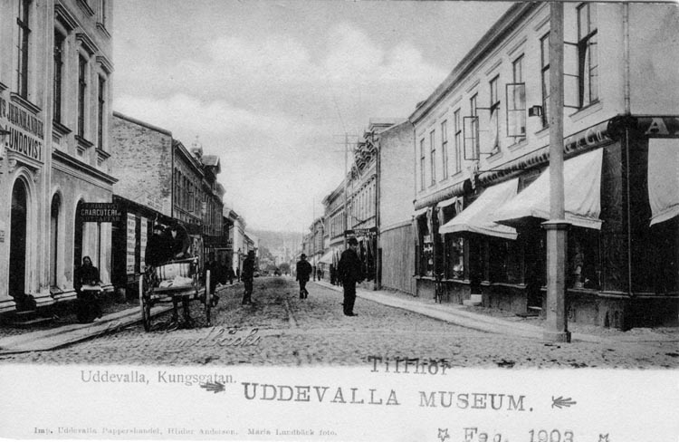 Tryckt text på vykortets framsida: "Kungsgatan, Uddevalla."