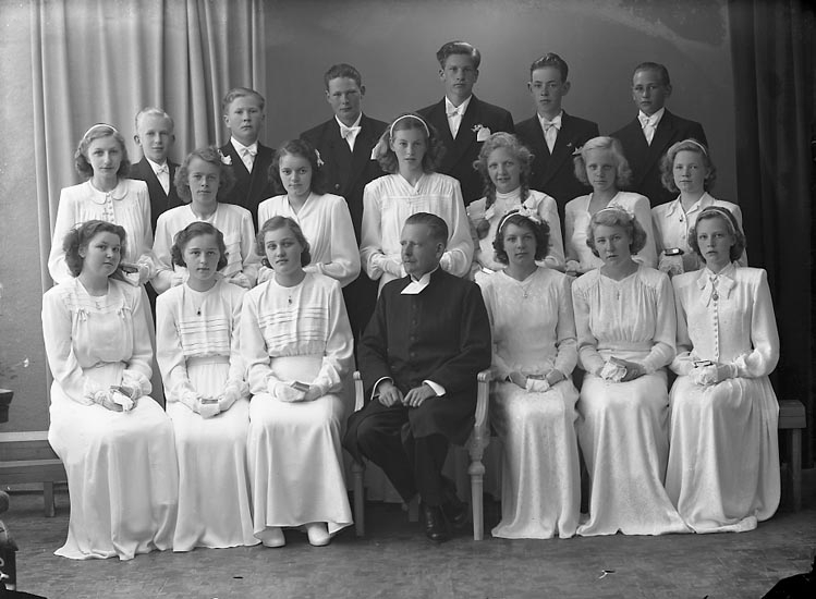 Enligt fotografens notering: "D. 18/5 1948. Kyrhoherde Norén, Ödsmåls Konfirmander".