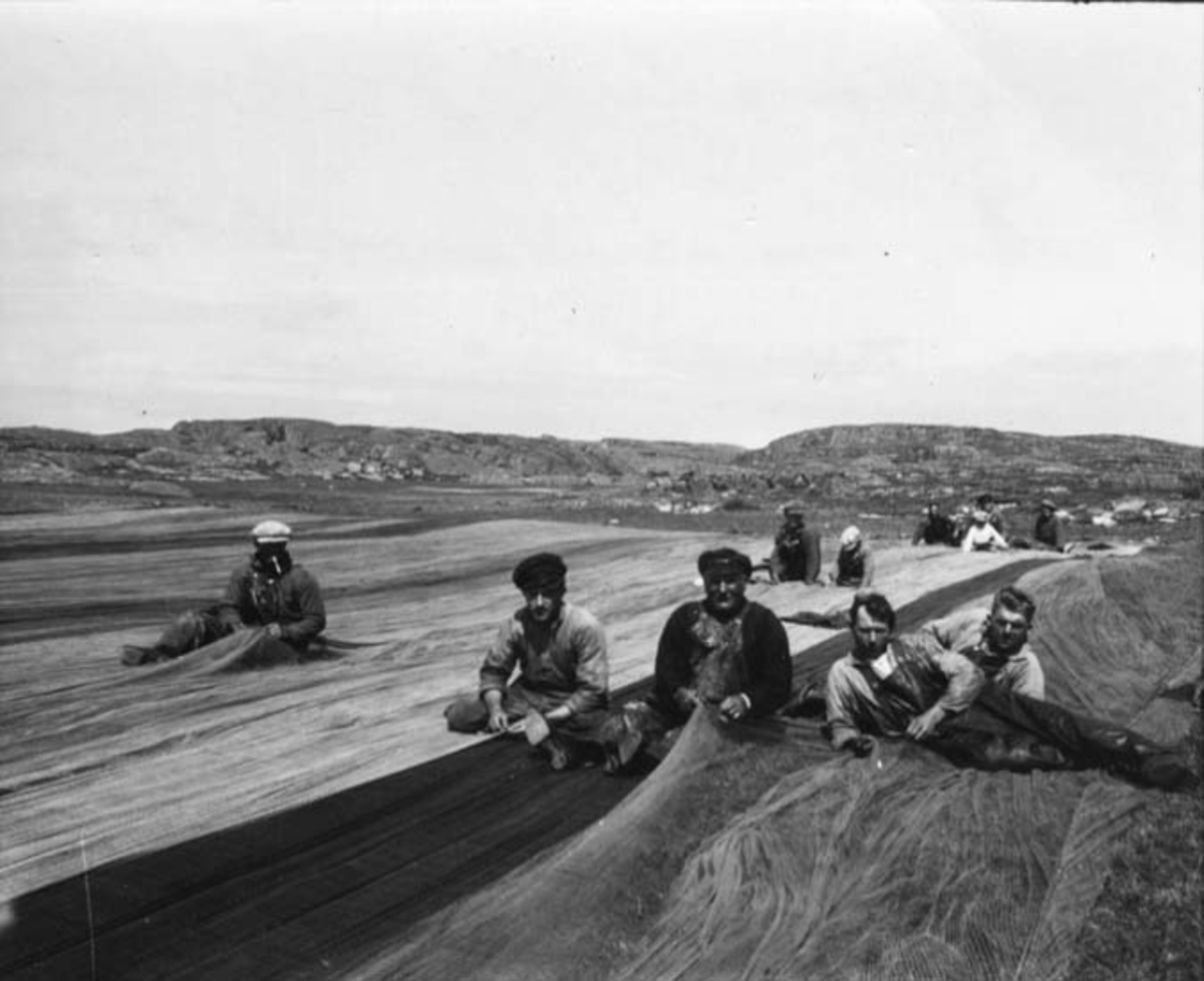 Skrivet på baksidan: Sillevaden på edet. En ny "slynga"(bit) sys (bindes) i vadet. Den mörka duken är ny och oblekt. En man syr på var söm. Jämnsides med varandra.
