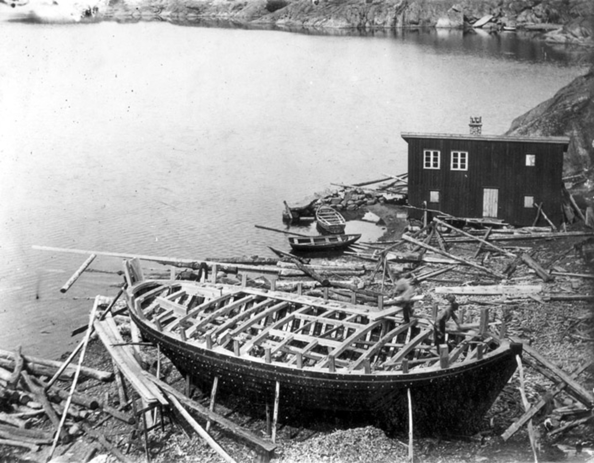 Skrivet på vidhängande papper: 48 fots klinkbåt under byggnad.