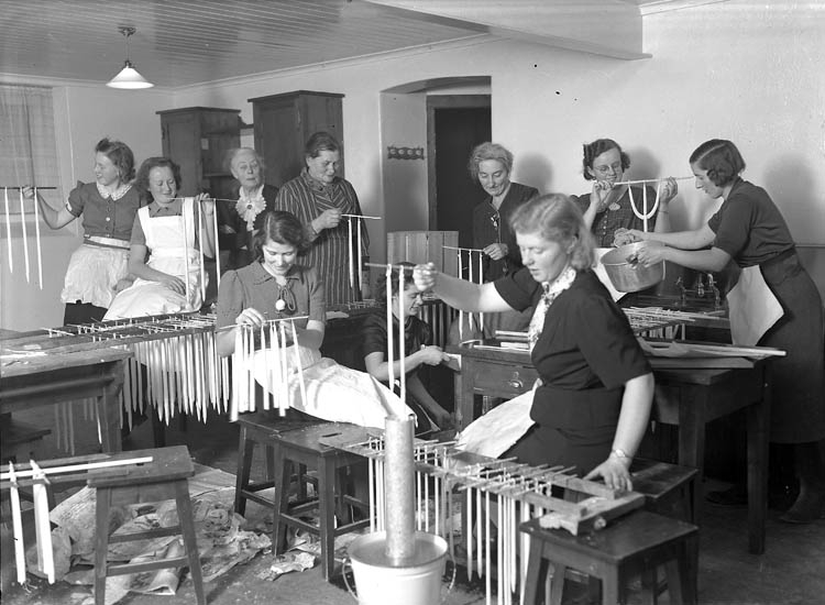 Text till bilden:"Stöpning av enkla och grenljus. En äldre lärarinna övervakar hanteringen. Röda Korsets ljusstöpning. Lärarinna Anni Wetterqist".