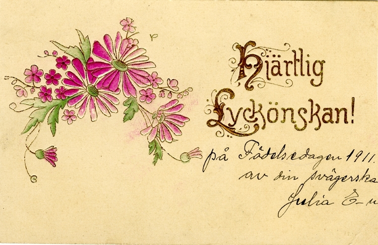 Notering på kortet: Hjärtlig Lyckönskan på födelsedagen av din svägerska Julia E-n.
