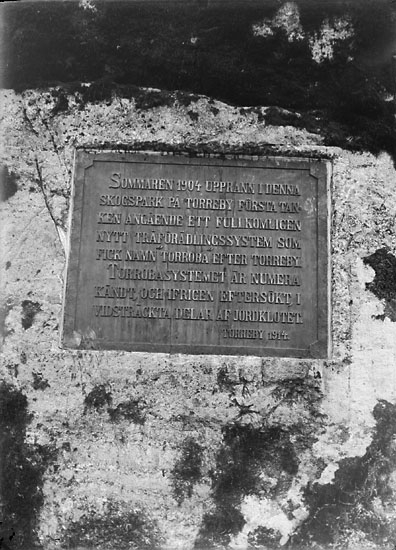 Enligt senare noteringar: "Metallplatta, Torrobasystemet, monterad på bergvägg vid Torreby slott. Plattan finns ännu kvar på sin plats. Torrobasystemet var ett av grosshandlare Sörensen framtaget träförädlingssystem, Uppgifter om systemet finns i Nordisk familjebok upplaga 1919, sid 447." (BJ)
