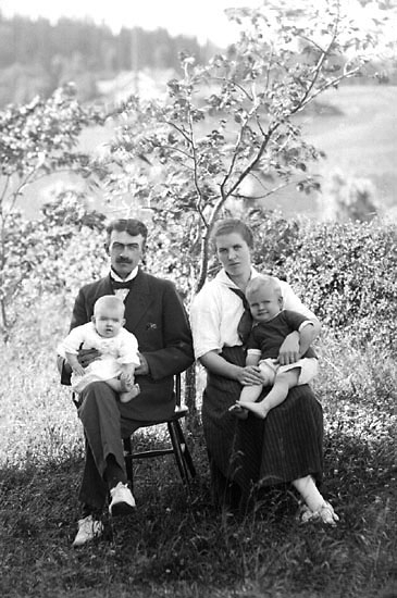 Enligt senare noteringar: "Familj sittande på pinnstolar i trädgård. Rudolf i Närestad.