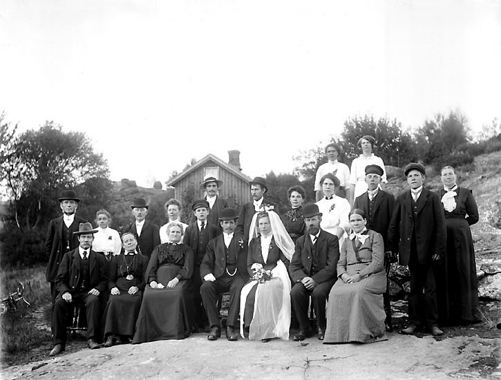 Enligt senare noteringar: "Brudpar med uppvaktning, någonstans i Foss." (BJ)