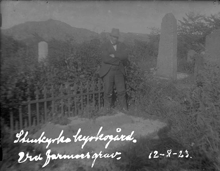 Enligt text på fotot: "Stenkyrka kyrkogård. Vid farmors grav. 12-8-23".