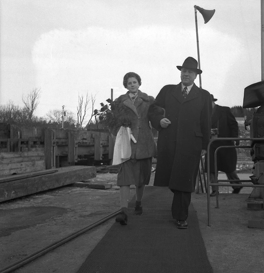 Titel: Sjösättning av 123 M/S Monica Smith. Flickan på bilden är fartygets gudmor.