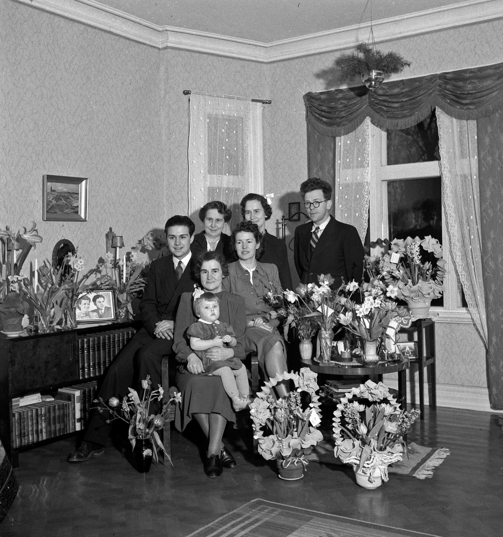 En grupp samlade vid blomsterbord.