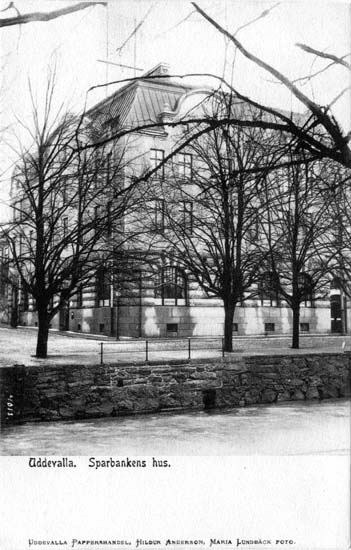 Tryckt text på vykortets framsida: "Uddevalla. Sparbankens hus."