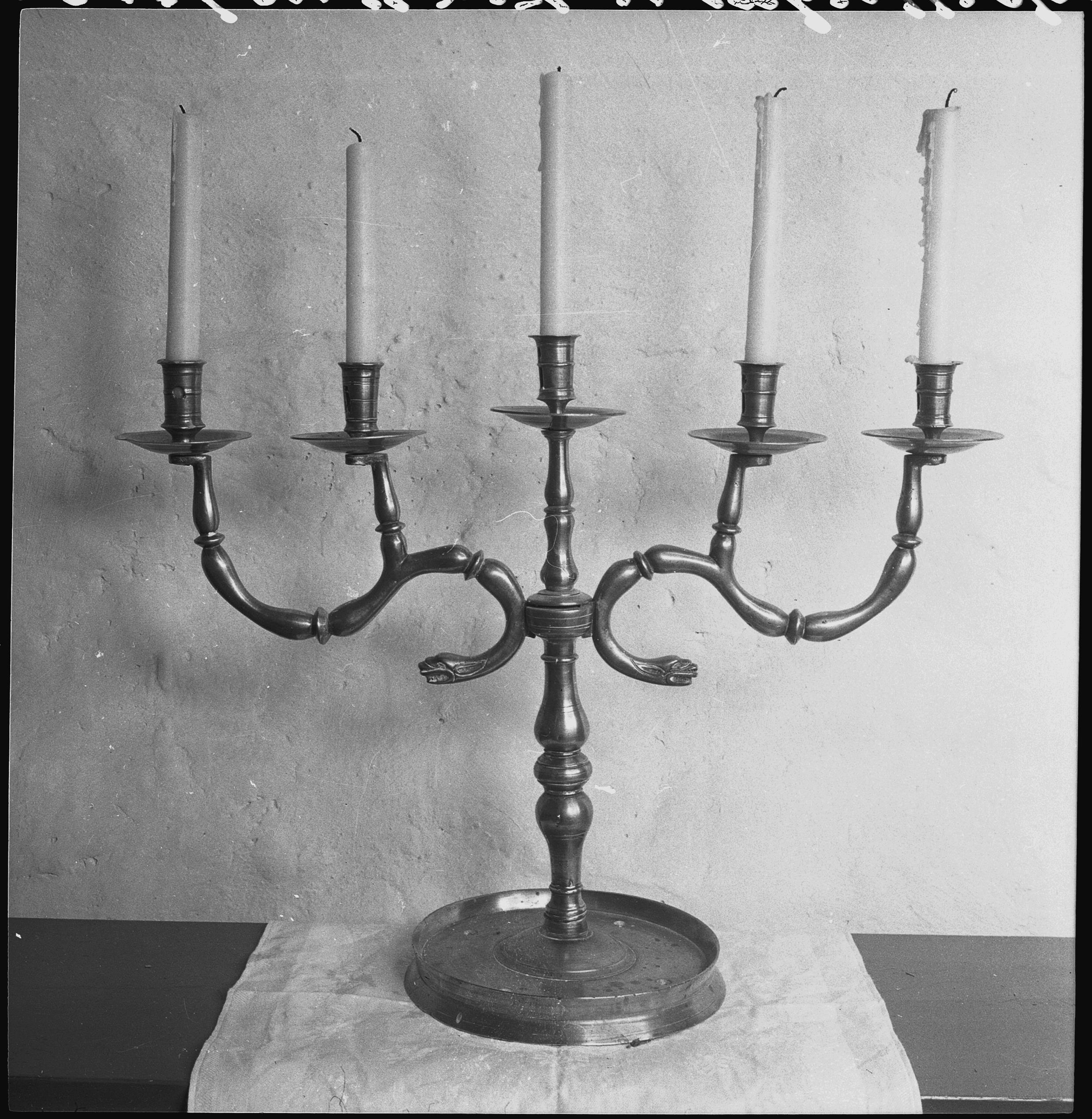 Kandelaber av gul metall för fem ljus, 1500-talets andra hälft.