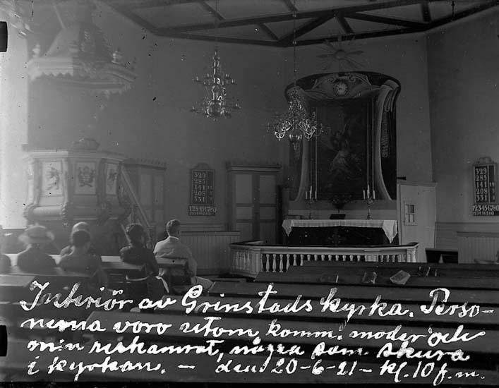 Enligt text på fotot: "Interör av Grinstads kyrka. Personerna voro utom komm. moder och min reskamrat, några som skura i kyrkan. - 20-6-21- kl. 10 f.m.".
