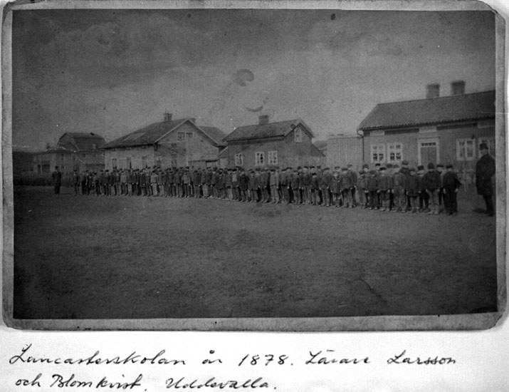 Handskrivet på bildens framsida: "Lancasterskolan år 1878. Lärare Larsson och Blomkvist. Uddevalla."