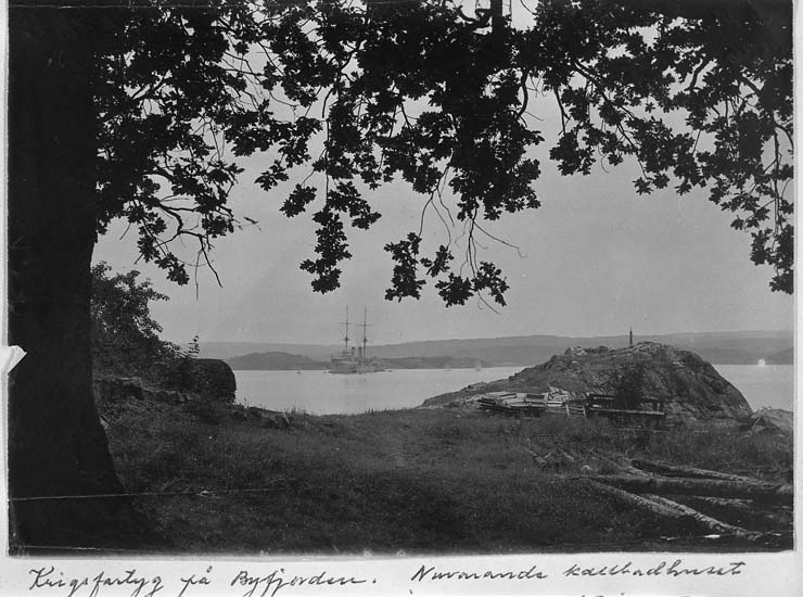 Text på kort: "Krigsfartyg på Byfjorden. Nuvarande kallbadhuset å Gustafsberg ligger på klippan med trävirket".