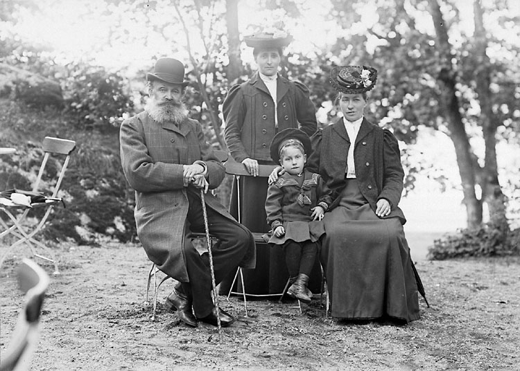 Enligt senare noteringar: "Gruppbild på man, två kvinnor och ett barn, vid trädgårdsstolar utomhus. Troligen tidigt på våren. Klädsel: vårdräkter."