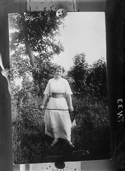 Enligt senare noteringar: "Avfotografering av foto med kvinna, utomhus, vimpel på vilken står "Arild"."