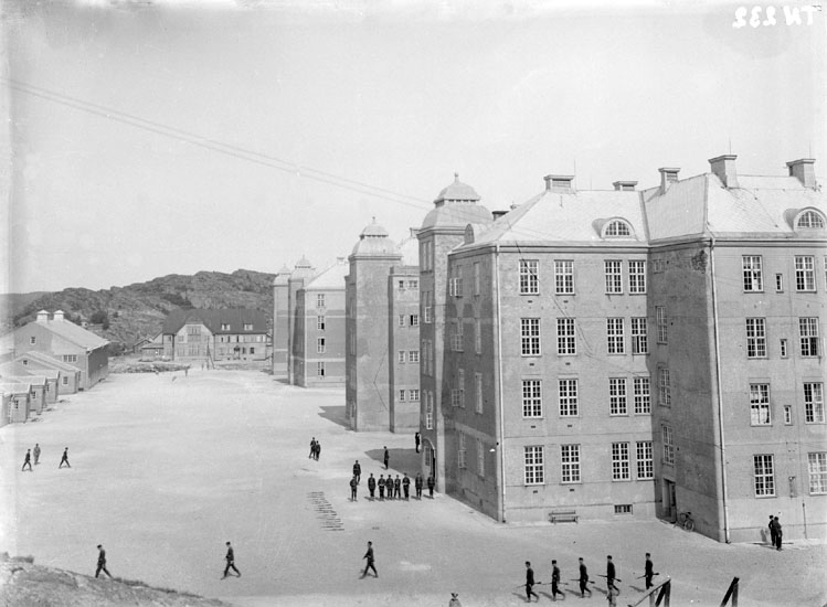 Enligt senare noteringar: "Bohusläns regemente. Kaserngården med övande gevärstrupper, från "musikberget"."