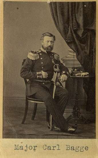 Text på kortets baksida: "Major Carl Bagge född 1803 död 1865. Hustru gift 1834 med Johanna Maria Pettersén född 1803 död 1875".