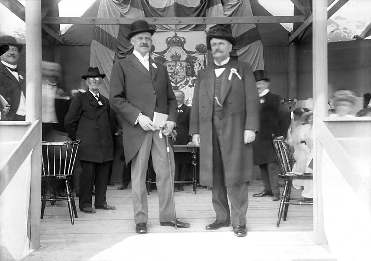 Enligt tidigare notering: "Hederstribunen på Margretegärde vid jubileumslantbruksmötet 1914. Till vänster jordbruksministern Friherre Johan Beck-Friis, född 1862. Till höger Landshövdingen Friherre Gustaf Lagerbring, född 1847, död 1921".