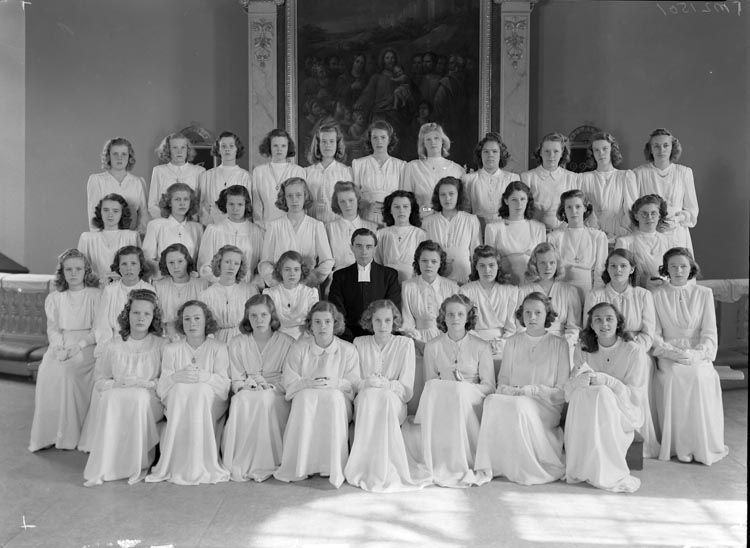 Uppgift enligt fotografen: "Uddevalla. Konfirmander. Pastor Bergelind."