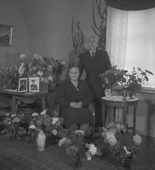 Text till bilden: "Fru Frida Olsson Skottgatan 27. 50 år. 1945.09.23".