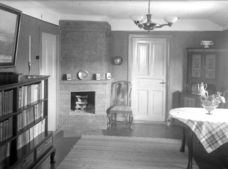 Text till bilden:"Låg bokhylla, Öppen spis, och hörnskåp målat i allmogestil. Riksdagsman W. Svensson".