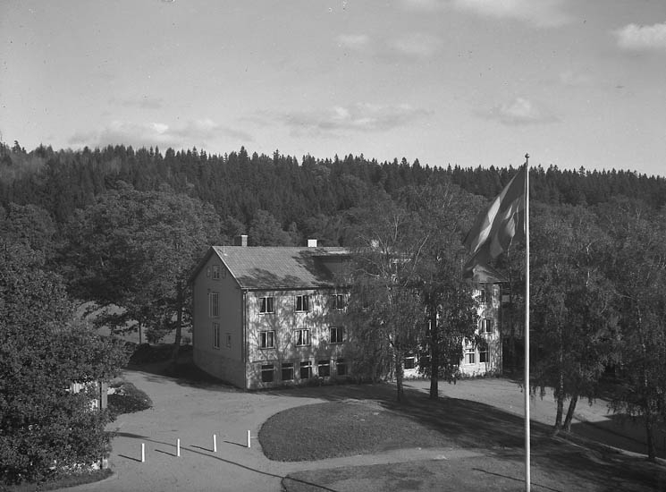 Text till bilden:"Skolanoch gårdsplanen är omgiven av barr och lövträd V.U.".