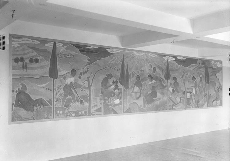 Text till bilden:"Tavla på väv. V.U. S. 17/6 1946. Motiv Jordbruk, Sömnad, Religion, matlagning och kemi".