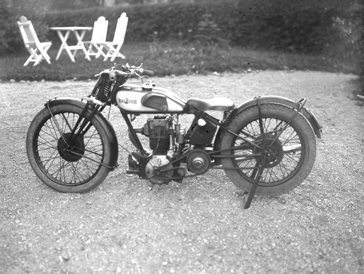 Motorcykel av märket Raleigh parkerad på en grusplan