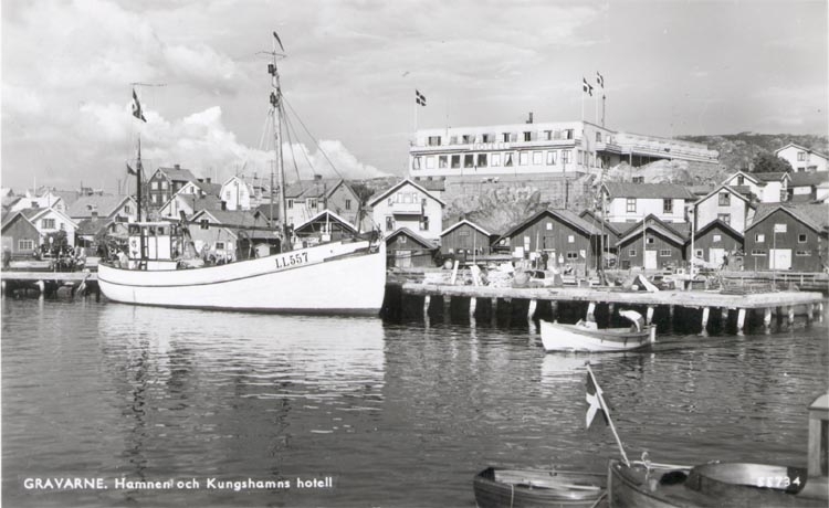 Tryckt text på kortet: "GRAVARNE. Hamnen och Kungshamns hotell".