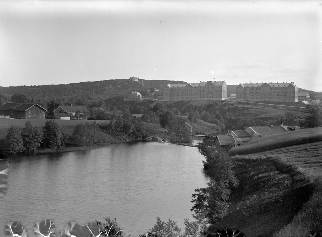 I förgrunden utmed Bäveån skymtas till höger Fossumbergs kvarn och till vänster om ån vid bron, Fossums kvarn. Till vänster om kasernerna finns musikberget med det första marketenteriet som användes fram till 1918 och något mer till vänster musikpaviljongen. På höjden i bakgrunden Ture Malmgrens borg som byggdes under åren 1899-1912