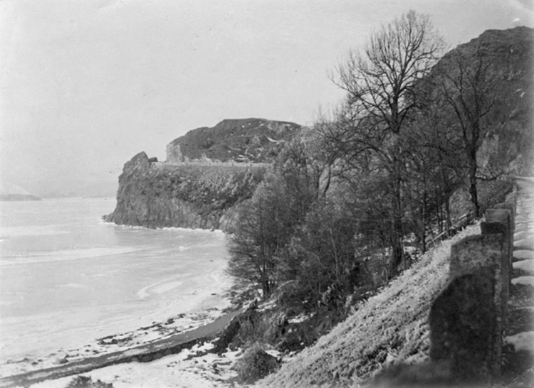 Bilden var uppklistrad på ett A4 papper. På papperet under bilden stod följande handskrivna text: "Uddevalla. Bodeleviken och nya landsvägen vid Hästepallarna".