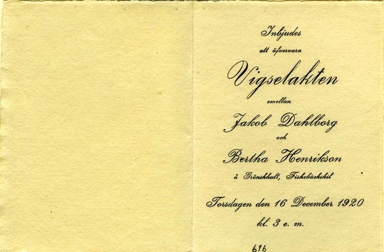Text på kortet: Inbjudes att öfvervara Vigselakten mellan Jacob Dahlborg och Bertha Henriksson å Grönskhult, Fiskebäckskil. Torsdagen den 16 December 1920 kl. 3 e.m.