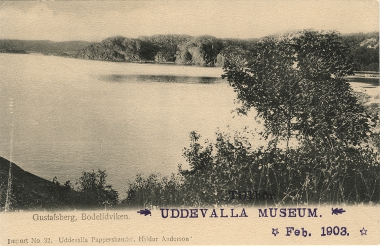 Tryckt text på vykortets framsida: "Gustafsberg, Bodelidviken."