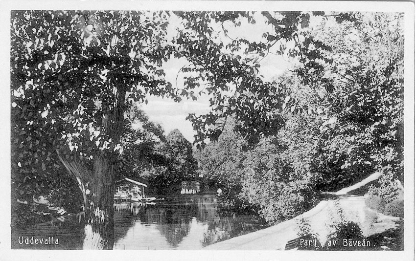 Tryckt text på vykortets framsida: "Uddevalla Parti av Bäveån".