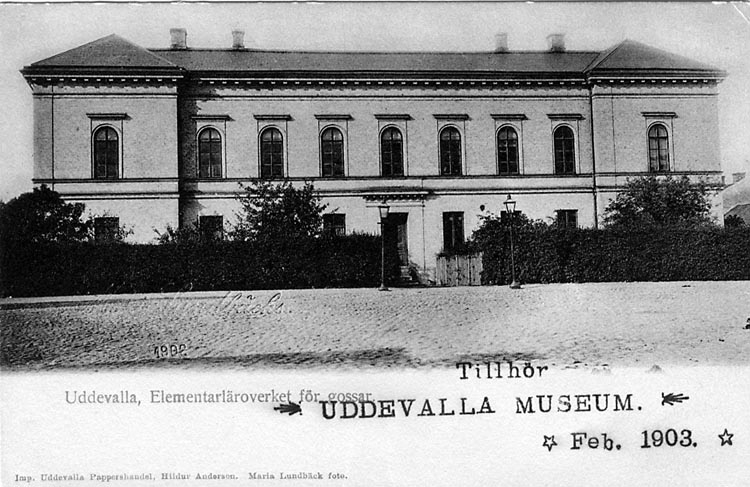 Tryckt text på vykortets framsida: "Uddevalla. Elementarläroverket för gossar".