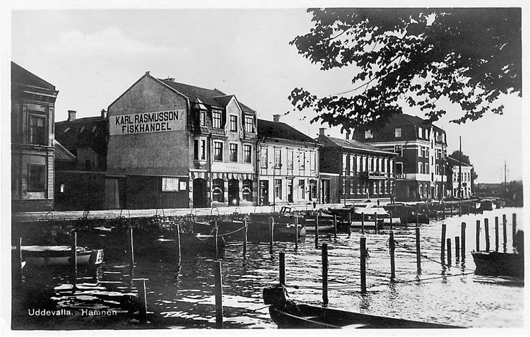 Titel: Tryckt text på vykortets framsida: "Uddevalla Hamnen".