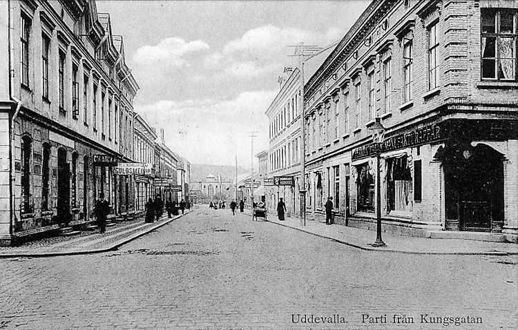Tryckt text på vykortets framsida: "Uddevalla Parti från Kungsgatan".